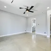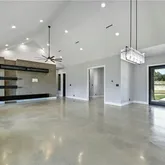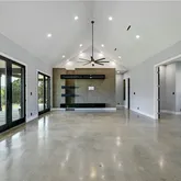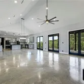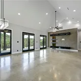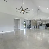 - Room Description 13: Spectacular great room open floor plan with towering vaulted ceilings and an oversized modern ceiling fan; Two sets of oversized glass doors open the living space onto the back porch and frame breathtaking views of the butte behind the home; Accent wall with built-in wire concealing system for your entertainment center; Refreshing polished concrete flooring