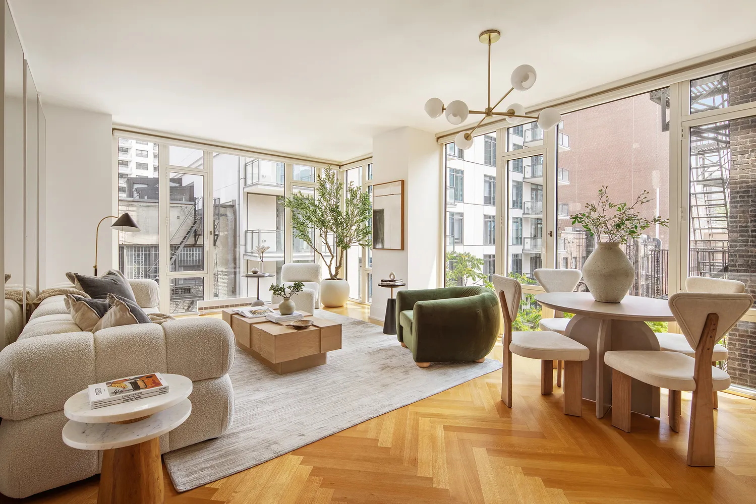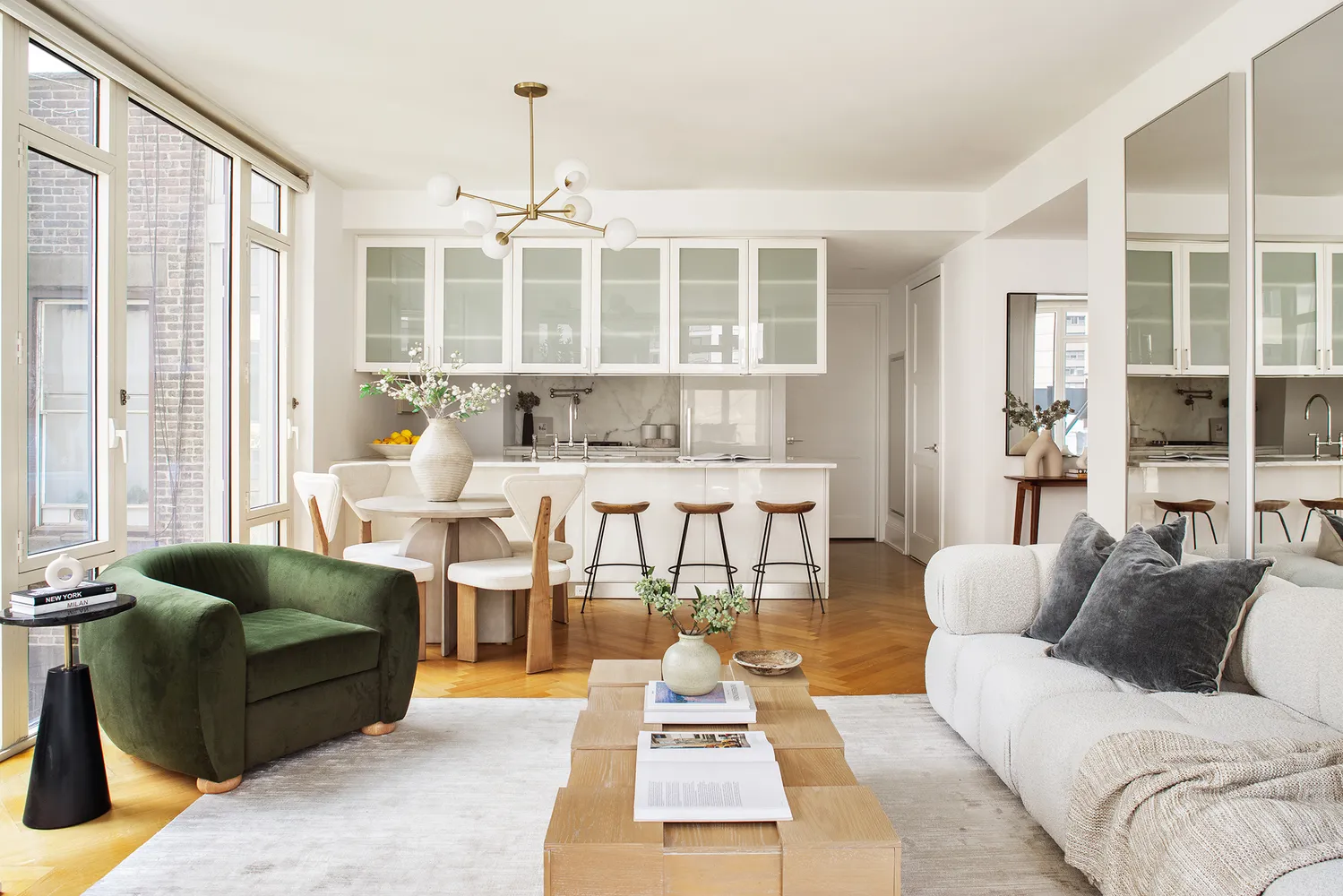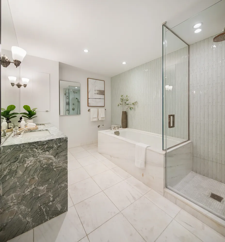 Additional highlights include white oak herringbone floors, high ceilings, triple-zone central air, and generous closet space throughout. Motorized shades are installed in every room for convenience and comfort.