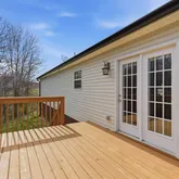 Oversized windows throughout the home bring in abundant natural light and frame views of the surrounding property. From the dining area, step directly onto the back deck overlooking a tree-lined backyard, where privacy and natural beauty create a serene outdoor living space. The kitchen sink is thoughtfully positioned to overlook the yard, making everyday moments feel connected to the outdoors.