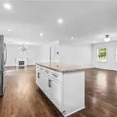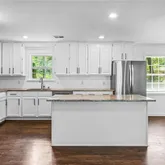 - Kitchen Features: Breakfast Bar, Cabinets White, Eat-in Kitchen, Kitchen Island, Solid Surface Counters, View to Family Room