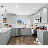 - Kitchen Appliances: Dishwasher, Free Standing Range, Microwave, Solid Surface Countertop, Stainless Steel Appliance