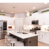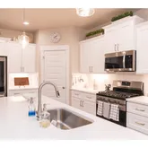 - Kitchen Appliances: Dishwasher, Disposal, Free Standing Gas Range, Free Standing Refrigerator, Island, Microwave, Pantry, Plumbed For Ice Maker, Quartz