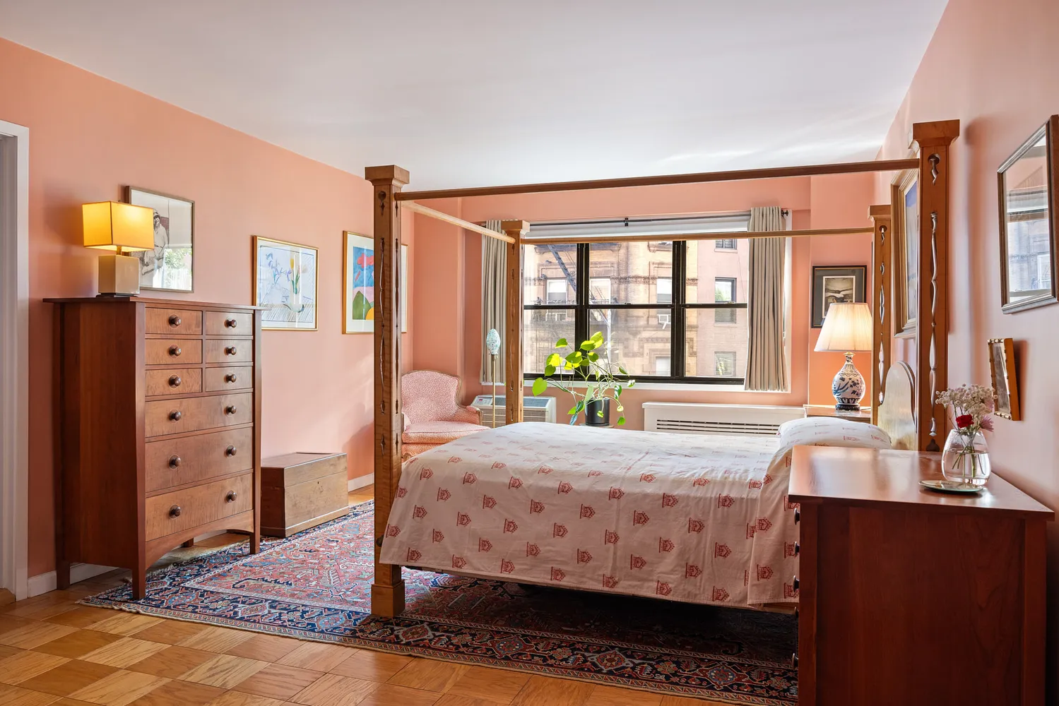 Boasting the largest two-bedroom, two-bathroom floor plan in the building, this elegant apartment creates a timeless ambiance with its sophisticated designer style and classic craftsmanship. Enjoy beautifully preserved original oak parquet floors, updated kitchen and baths, solid floor-to-ceiling wood doors, skim-coated walls, and custom blinds.