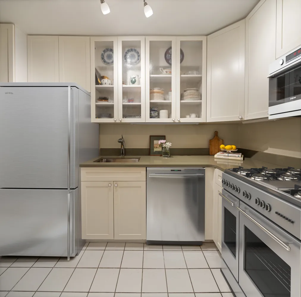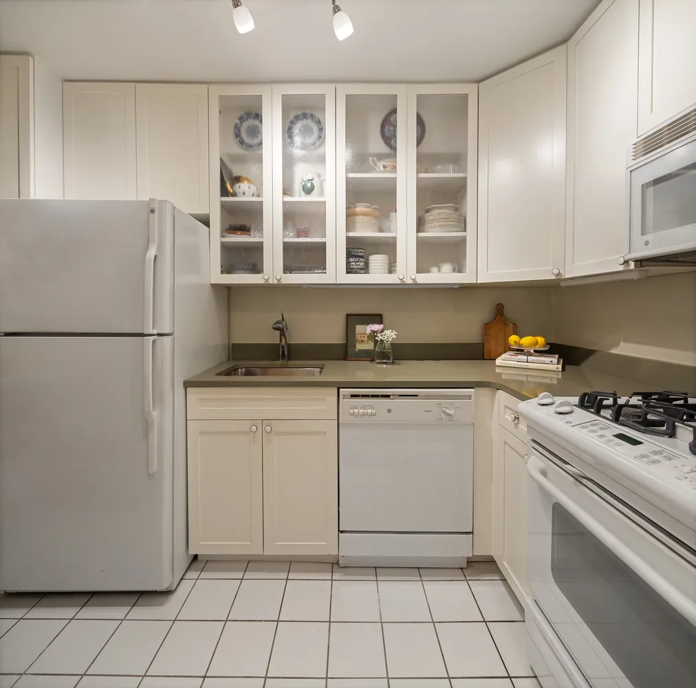 A gracious entry flanked by a coat closet invites you into the spacious 20-foot by 14-foot living room, offering a generous footprint for seating and dining areas alongside large western windows and views that skim over landmarked low-rise buildings. Delight in spectacular golden hour sunlight and open-sky outlooks that are forever protected thanks to the home's position within the Greenwich Village Historic District. The adjacent kitchen is finished with updated Shaker-style and glass-front cabinetry, solid gray countertops, and full-size GE appliances, including a gas range, dishwasher, and built-in microwave. Enjoy the separate kitchen as is, or easily open the space into the living room as shown in the alternate floor plan.