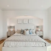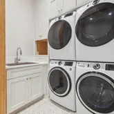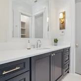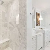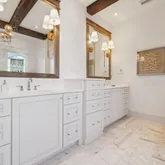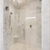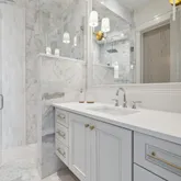 Bathrooms are spa-inspired, featuring marble showers enhanced by subtle backlighting for a refined and immersive experience. Designer lighting throughout the home adds layers of ambiance and style, reinforcing the home's cohesive, high-end aesthetic.