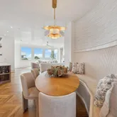 Venetian plaster walls add a soft, luminous texture that elevates the interiors with understated elegance. A custom fluted wood banquette anchors the dining area with sculptural sophistication, while the brick fireplace offers a classic focal point that grounds the main living space.