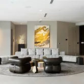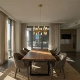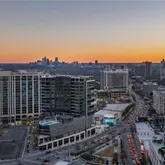 The expansive living and dining area is ideal for entertaining and is highlighted by a sleek ventless fireplace and three walls of floor-to-ceiling windows showcasing views of downtown Atlanta, Stone Mountain, and the Buckhead skyline. Retract the NanaWall door system to extend the living and dining space onto a covered terrace featuring a fireplace, television, gas grill, and ample space for lounge seating — perfect for indoor-outdoor living year-round!