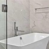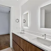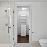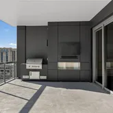 The primary suite offers downtown Atlanta views and direct access to the covered terrace. The primary ensuite bathroom features Pedini cabinetry, double vanities, water closet, frameless glass shower, Victoria + Albert soaking tub, and a walk-in closet with custom built-ins. The second bedroom provides guests with a private balcony, walk-in closet, and ensuite bathroom with double vanities. The den conveniently connects to the guest ensuite bath thereby enhancing its functionality.