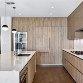 The chef’s kitchen, complete with a wet bar, features Cambria quartz countertops with a waterfall island, Pedini cabinetry, and a full suite of Gaggenau appliances including refrigerator, convection oven, steam oven, gas cooktop, wine tower, microwave, and dishwasher.
