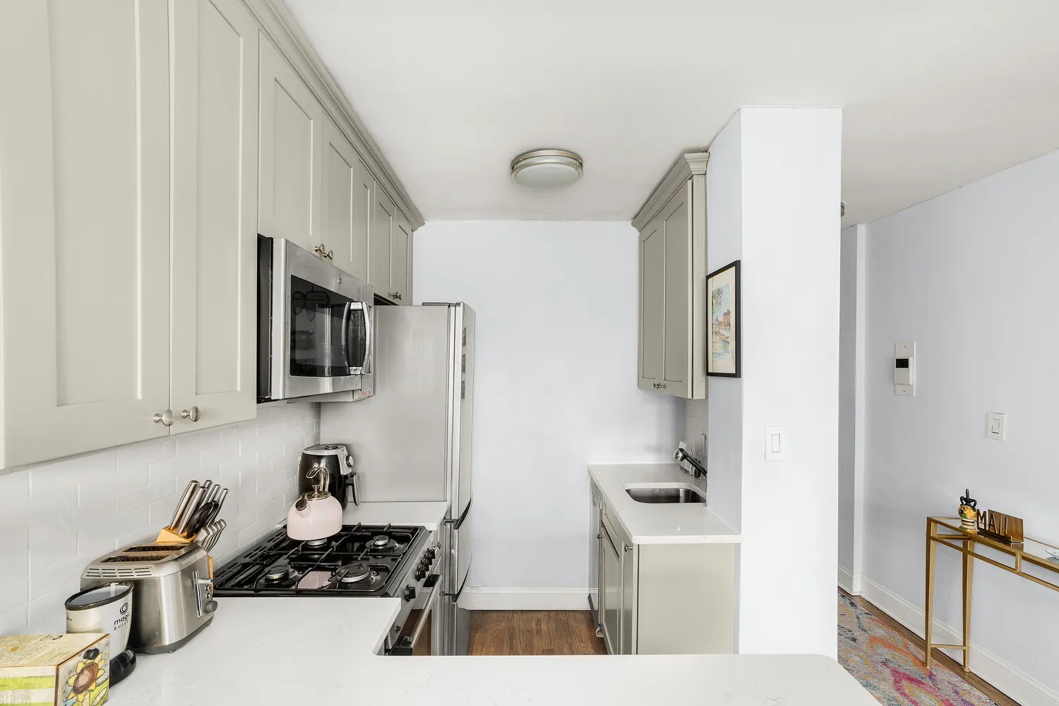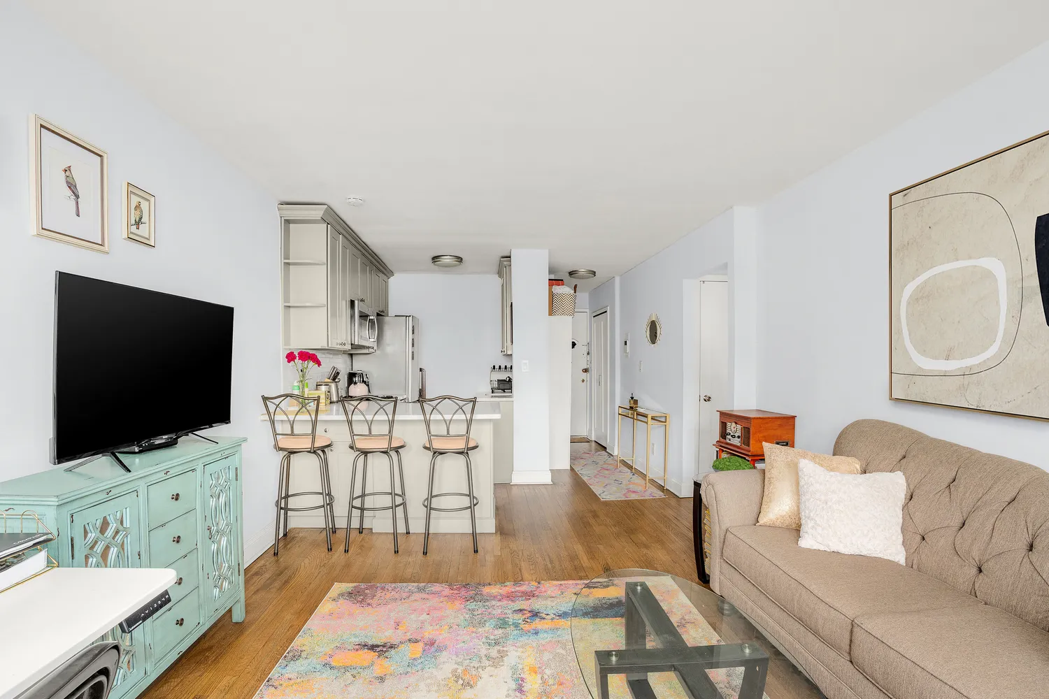 Upon entering the home, you are welcomed by an entry hallway—flanked by a closet and a storage nook—that flows into the main room. Three large windows in the living space provide northern exposures and great light throughout the day. The beautifully designed and thoughtfully renovated open kitchen offers a breakfast bar for dining, abundant cabinetry, generous counter space, and the convenience of a dishwasher.