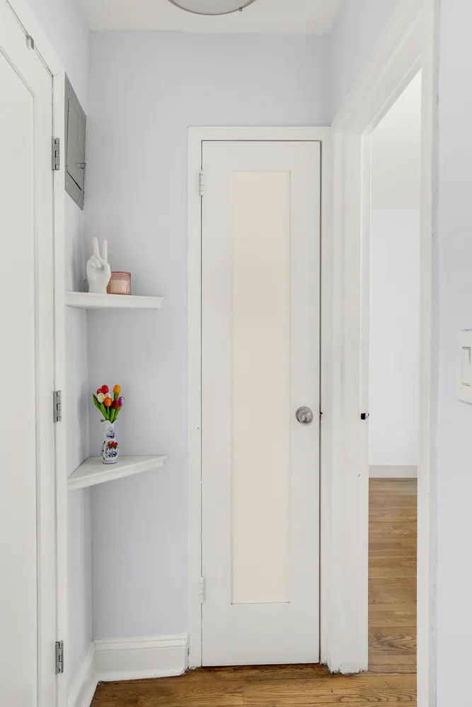 The spacious bedroom provides a serene retreat and ample light, plus abundant closet space. The renovated bathroom, conveniently located just outside the bedroom, features a wall-mounted sink and provides easy access for guests. There is a linen closet just outside the bathroom for additional storage. Long plank wood floors provide elegance and a modern feel throughout the home.