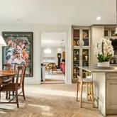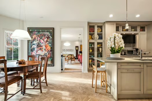On the main level, the entry hall opens to a welcoming living room with stone fireplace, parquet floors, tall ceilings, built in bar, and a wall of glass doors opening to the deck. The Chef’s kitchen centers around a beautiful large island, with stainless appliances, gas range, custom backsplash, glass cabinetry, breakfast nook and storage—well suited to both hosting and daily routines. Additional spaces include a formal dining room, powder room, and laundry room with storage. The primary suite with a modern bath, two walk-in closets, and dedicated dressing area. There is also a dedicated office with a full bath, built in desk, natural light, and a bespoke den with custom cabinetry, custom bookcases and picture windows offering ample natural light.