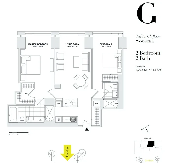This split two bedroom, two full bathroom apartment spans over 1225SF, features sound resistant and insulated floor-to-ceiling windows all equipped with custom motorized shades and facing east overlooking quiet Wooster Street bringing in great light and a serene Soho view. Both bedrooms are well-proportioned with the primary bedroom having a walk in closet and an exquisite five fixture marble-clad bathroom. The modern kitchen is equipped with all high end appliances from Gagganau, Mile and Bosch and features a breakfast bar that opens nicely into the living and entertaining area. Tall (as high as 10 ft) ceiling height throughout, in-unit washer/dryer.