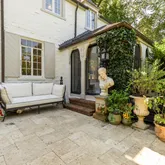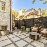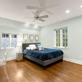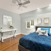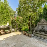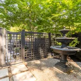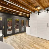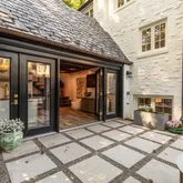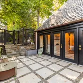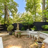 The main house updates feature a new open-concept gourmet kitchen with white shaker-style cabinets, stunning black marble-look quartzite countertops, and high-end stainless steel appliances, including a Wolf gas stove and Sub- Zero refrigerator, with newly refinished hardwood floors throughout. The spacious living room offers gorgeous, newly refinished hardwood floors, high ceilings, wall-to-wall box molding, and a wood-burning fireplace with an original built-in "ash pit" feature for easy clean-up. The living room opens into a sunroom with a dramatic peaked ceiling that has sliding glass doors to a private travertine patio with a water feature, surrounded by mature landscaping.
