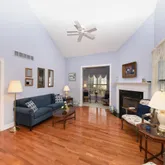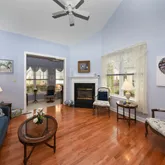 flooring and offers a dramatic vaulted ceiling, a cozy gas fireplace, and a ceiling fan,