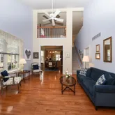 storage shelves. Upstairs, the second-floor loft overlooks the living room, creating an