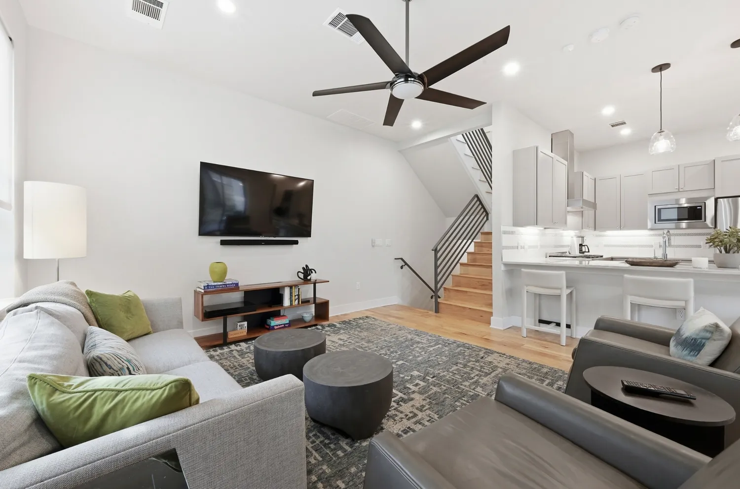 The main level is open and bright— hardwood floors throughout,...This charming & well kept 3-bed, 3.5-bath townhome in the heart of South Austin 78704 checks all the boxes: Built in 2018, a two-car garage, four total parking spots, a fenced backyard with a deck, and a huge rooftop terrace that sits directly under a canopy of mature live oaks. Only two miles from downtown in the South Lamar / Bouldin Creek area. (In process of Making Ready, outdoor wooden siding will be freshly painted/stained, etc).