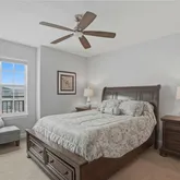 The waterside primary suite opens directly to the balcony and features dual vanities, a jetted tub, an expansive walk-in shower with bench seating, and generous closet space. Each additional bedroom includes its own en-suite bath and walk-in closet, and a separate powder room serves guests.