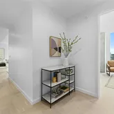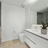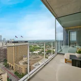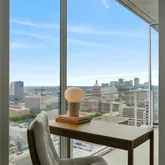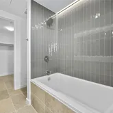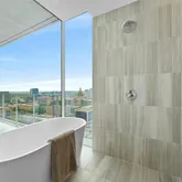- Room Description: The primary bathroom is a serene retreat featuring floor-to-ceiling windows that bathe the space in natural light & frame breathtaking city views. A garden bathtub w/ wood-look tile accents adds a touch of natural elegance, perfectly positioned for soaking while enjoying the skyline. The frameless glass shower offers a sleek, modern aesthetic, while the dual vanity w/ crisp white cabinetry and a wide horizontal mirror enhances both functionality and spaciousness.