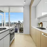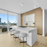- Room Description: The kitchen showcases a sleek, minimalist design with cabinetry that blends seamlessly into the walls for a clean, streamlined look. Thoughtfully positioned within an open floor plan, it offers sweeping panoramic city views—allowing you to cook or bake while taking in the skyline. A central island equipped with premium Bosch appliances, including a cooktop, oven, and microwave, enhances both style and functionality, creating an inspiring space where form meets function.