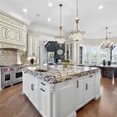 Perfectly positioned to capture sweeping views of the lake and the 18th fairway at The Manor, this gated brick-and-stone estate pairs timeless architecture with resort-level amenities and exceptional outdoor living. A private drive leads through the gates to a circular motor court, setting the tone for what’s inside—an impressive two-story foyer topped by an open gallery and anchored by a curved staircase wrapped in detailed ironwork. Upon entry, you’re immediately greeted by dramatic two-story ceiling...Perfectly positioned to capture sweeping views of the lake and the 18th fairway at The Manor, this gated brick-and-stone estate pairs timeless architecture with resort-level amenities and exceptional outdoor living. A private drive leads through the gates to a circular motor court, setting the tone for what’s inside—an impressive two-story foyer topped by an open gallery and anchored by a curved staircase wrapped in detailed ironwork. Upon entry, you’re immediately greeted by dramatic two-story ceiling heights illuminated by twin crystal chandeliers, creating a breathtaking first impression. For effortless living, the home also offers an elevator that services all floors. Designed for both elevated entertaining and everyday comfort, the main level flows from an elegant dining room to a richly appointed wood-paneled study with coffered ceiling, statement lighting, a fireplace, and custom built-ins. At the center of the home, the chef’s kitchen features an oversized island with seating, triple-edge countertops, custom cabinetry, and premium Sub-Zero/Wolf appliances, along with a light-filled, circular breakfast area. The kitchen opens to a striking family room where wood trusses span the soaring cathedral ceiling. The primary suite on the main level is a true retreat, complete with a sitting area, fireplace, and a dramatic double-tray ceiling adorned with two matching chandeliers. The spa-inspired bath offers separate vanities, a soaking tub, and an expansive multi-head shower, while the extraordinary two-story custom closet—with built-ins and a center island—keeps everything beautifully organized. Also on the main level is a one-of-a-kind entertaining lounge that connects seamlessly to the pool and outdoor spaces, featuring a full-scale bar with floor-to-ceiling cabinetry, beverage cooler, ice maker, dishwasher, and a full-size wine refrigerator. Nearby, a sun-drenched living room showcases a curved wall of windows and a stone fireplace. Upstairs, a generous landing/bonus area is complemented by four spacious en suite bedrooms, additional play space, and a distinctive domed, circular sitting room wrapped in floor-to-ceiling windows overlooking the grounds. The terrace level continues the experience with a second kitchen/bar, a 500-bottle climate-controlled wine cellar, family and game rooms, billiards and arcade areas, a home theater, and a gym with private massage room—plus a full in-law suite with its own kitchen and sitting room. Above the garage, a private suite with a full bath—previously used as a salon—offers exceptional flexibility as an au pair or guest suite, home office, creative studio, or additional living space. Outside, enjoy multiple living areas including a covered veranda overlooking the heated vanishing-edge pool and spa, in-ground trampoline, turf play area, and a basketball court—all framed by impressive privacy, lake views, and golf-front scenery. Completing the property is a six-car garage, featuring double-height ceilings—ideal for the car enthusiast and perfectly suited for adding vehicle lifts to expand capacity and showcase an exceptional collection.