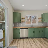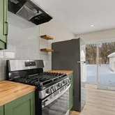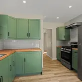 - Kitchen has upgraded soft close cabinetry, beautiful butcher block countertops and new stainless appliances. The layout features: