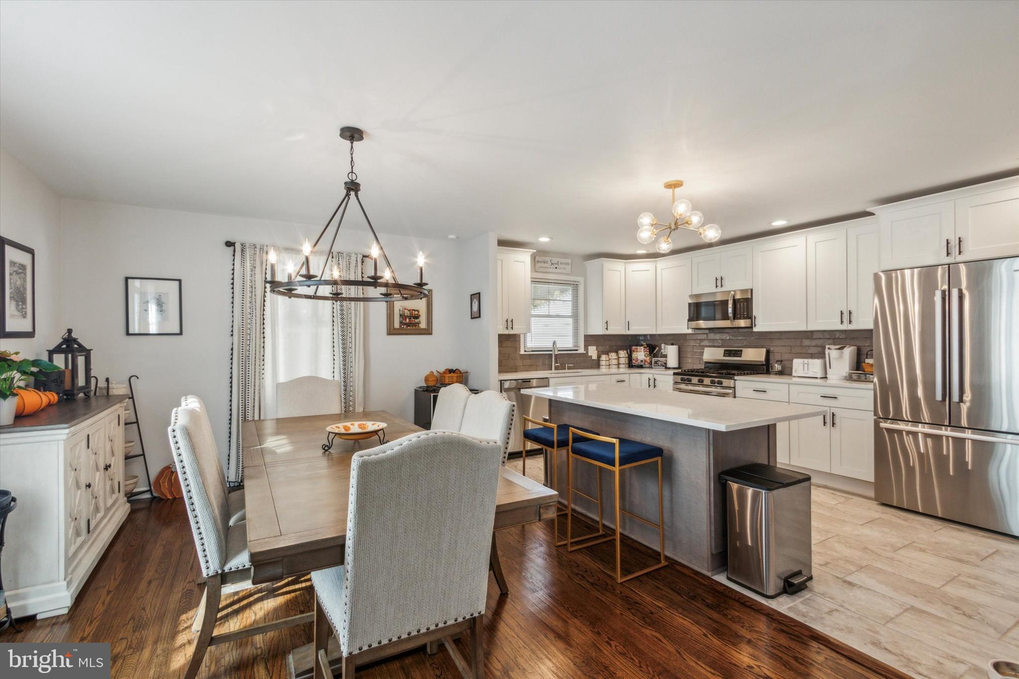 On the main level you have the large, bright living room and you'll fall in love with the newly renovated kitchen and open dining room. The kitchen boasts elegant white cabinets, a sizable island with seating for 3-4, stainless steel appliances, granite countertops, and a stylish tiled backsplash and flooring.