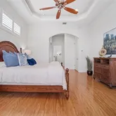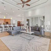 - Interior Features: Accessibility Features, Ceiling Fan(s), Central Vacuum, Crown Molding, Eating Space In Kitchen, High Ceilings, In Wall Pest System, Kitchen/Family Room Combo, L Dining, Open Floorplan, Pest Guard System, Primary Bedroom Main Floor, Solid Surface Counters, Solid Wood Cabinets, Split Bedroom, Stone Counters, Tray Ceiling(s), Walk-In Closet(s)
