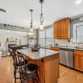 The updated kitchen is designed for both everyday living and entertaining, featuring a center island plus additional space for a kitchen table, creating a comfortable eat-in kitchen perfect for casual meals or morning coffee.
