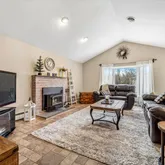 Just off the kitchen, the family room is a standout feature of the home, offering high ceilings with recessed lighting, oversized windows that flood the space with natural light, and a cozy wood-burning stove that makes the room feel warm and inviting in every season. A separate door leads directly from the family room to the rear deck, creating an easy connection to the outdoor living space.