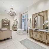 Infused with elegance, the superb primary bath features a fireplace, built-in Louis XVII-inspired commodes with marble tops, double sinks, and set-in mirrors with faux gold leaf. A steam shower features multiple heads, and a white porcelain soaking tub rests beside a balconet window.](https://www.compass.com/m/45225cbb503f0b6576ea8ede8e671ea5daced314_img_13_52846/origin.webp)