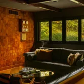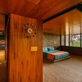 The main home's luxurious accommodations begin with a private and sprawling owner's suite featuring a king-size bedroom, a skylit ensuite spa bathroom with a 12-piece Kohler luxury shower system, and rows of generous closet space, including a custom walk-in. The attached bonus room is ideal as a gym, media room, or private office with stained glass windows. Two large secondary bedrooms and a full hall bathroom complete this wing. A second wing of the home includes an additional private bedroom suite with a full bathroom, which is perfect for guests or staff. The massive family room is a perfect gathering spot featuring beamed ceilings, custom built-ins, Knoll Maharam wallcoverings and original leather wallcoverings. A breakfast room, laundry room, powder room, and oversized storage room complete the beautifully planned layout. Outside a winding driveway, motor court, and five garaged spaces provide plenty of parking for car buffs, while the stone façade and walls of glass reinforce the midcentury style of this sophisticated hideaway.