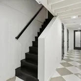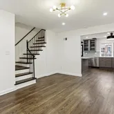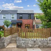 Original wrought iron railing leads you upstairs to three bedrooms - a primary with two spacious closets and plenty of room for a king bed, a second bedroom with room for a queen, and a third bedroom, perfect for an office or nursery. Brand new bathroom with full sized vanity, brushed nickel fixtures, new tiling throughout, and an original skylight! Fully finished basement with separate entrance contains a den/family room, full sized room with closet, large hallway closet, brand new large bathroom with tiled walk-in shower, washer/dryer, and beautifully painted harlequin floors. New central air conditioning ductwork and heating throughout.
