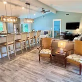 showcased by a festive turquoise wall with big comfy chairs & overhead fan, creating a perfect spot