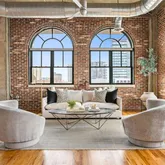 soaring 12’ ceilings, exposed brick, real hardwood floors and oversized Palladian windows,