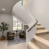 A striking metal pivot front door with biometric entry opens to dramatic interiors anchored by a sculptural curved arcustone staircase, full aluminum windows and doors, and carefully curated finishes throughout. Designed for both refined living and elevated entertaining, the home features a chef’s kitchen with Thermador appliances, double islands, scullery, and wine refrigeration, along with a club room showcasing a built-in humidor and illuminated liquor display.