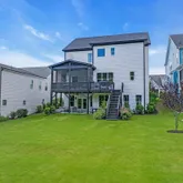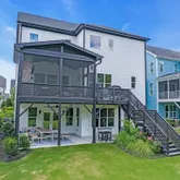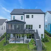 Second floor includes primary suite with spacious...Custom home in Wendell Falls offering over 5,000 sq ft across three finished levels plus walk-out basement, with elevator-ready framing for future accessibility. Main level features 10-ft ceilings, black windows, and gas fireplace with custom tile surround. Formal dining room and guest suite with full bath provide flexible main-level living. Sliding glass doors open to a covered screened porch with outdoor fireplace, extending usable living space.