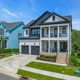 Exterior features include double front porches, covered rear porch, and two-car garage. Backyard borders a natural area, offering added privacy and open views. Property is positioned near community amenities including pool, playground, and trail system. Farmhouse Café, community gathering spaces, and additional neighborhood amenities are located nearby.