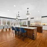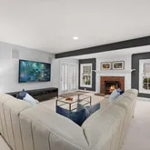 This wing of the home also includes a functional mudroom, a separate laundry room, and a generous walk-in pantry with custom wraparound shelving. Completing the main level are a welcoming family room with fireplace, a private study, and formal living and dining rooms defined by modern, airy elegance.