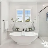 The second floor features the primary bedroom with a spacious, upscale bathroom showcasing high-end finishes and a solid surface soaking tub, as well as two guest bedrooms, each thoughtfully designed to provide comfort and convenience.