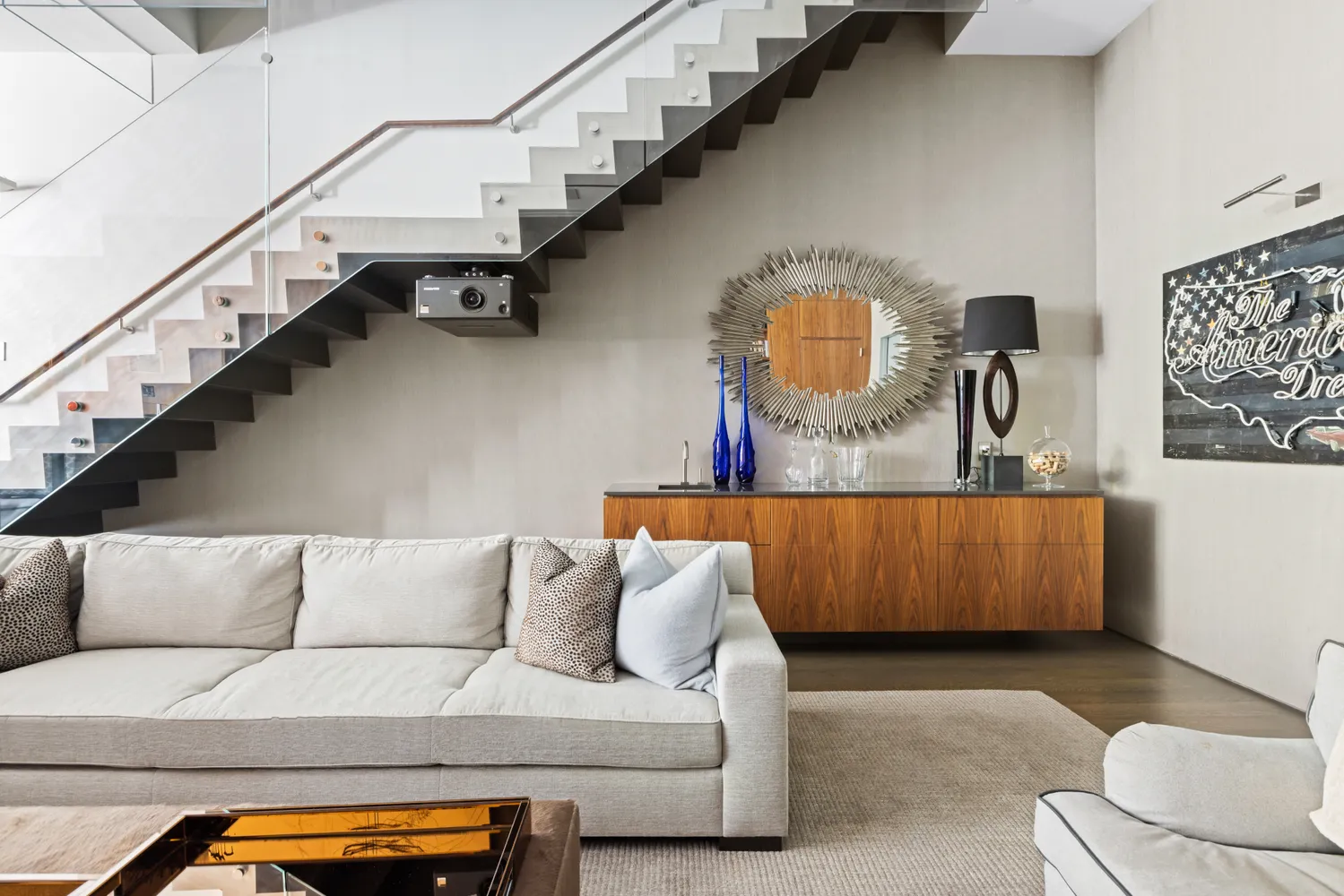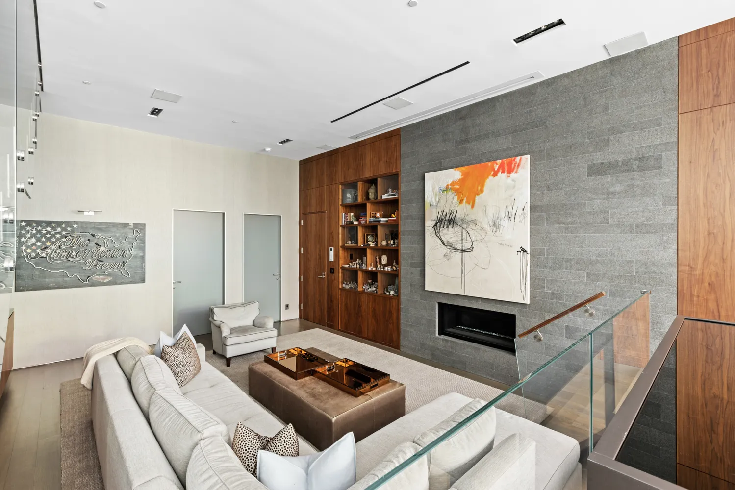 Meticulously-appointed interiors exude attention to detail and enjoy plentiful natural light. Soaring 14+ foot ceilings, a 5-foot gas-burning fireplace with Pompeii stone hearth, heated Basaltina stone tile and Mafi wide-plank wood floors in the living and dining areas, custom closets on every floor, and walls of glass with sliders for seamless indoor-outdoor entertaining are among the refined elements creating a sophisticated urban oasis.