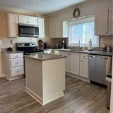 - Kitchen Features: Cabinets White, Stone Counters, View to Family Room