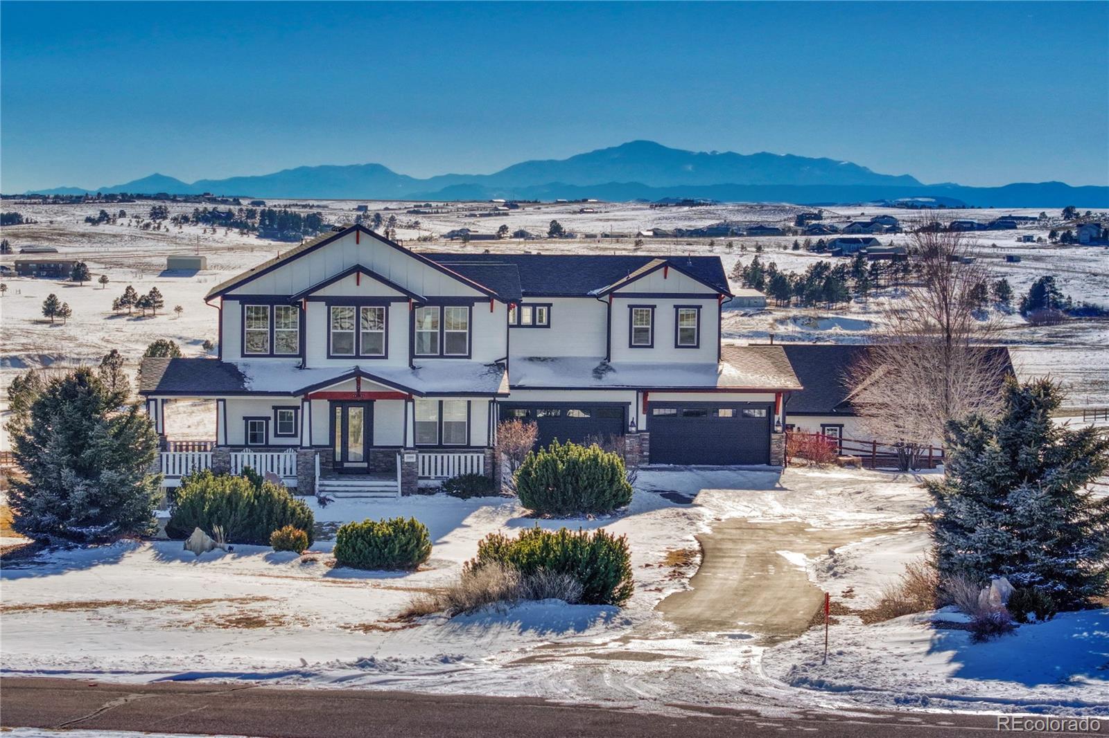 This property is absolutely stunning. Come see panoramic Pikes Peak mountain views of the front range on a quiet secluded 5.5 acre lot in Wild Pointe, and only minutes from Parker, Castle Rock, and DTC. Property is fully updated with interior and exterior paint, a gourmet kitchen, theatre room, workout room, walkout basement, professional landscaping, front & back covered patios, fenced dog run, heated garages for 12 vehicles, horse stalls & fencing, and a separate guest house with 2 extra bedrooms....This property is absolutely stunning. Come see panoramic Pikes Peak mountain views of the front range on a quiet secluded 5.5 acre lot in Wild Pointe, and only minutes from Parker, Castle Rock, and DTC. Property is fully updated with interior and exterior paint, a gourmet kitchen, theatre room, workout room, walkout basement, professional landscaping, front & back covered patios, fenced dog run, heated garages for 12 vehicles, horse stalls & fencing, and a separate guest house with 2 extra bedrooms. Main level has floor to ceiling stone fireplace surround, office, formal dining area, substantial mud room with a 2nd laundry area, new LVP flooring, high ceilings, & an attached 4 vehicle garage. Kitchen includes a Thermador professional gas range/double oven/fryolator, beautiful cabinets, large slab quartz counters, tasteful back splash, and dinette area. Upper level has a sizable primary suite, 3 more bedrooms, 3 bathrooms, and laundry room. Large primary suite has lots of natural lighting with spectacular views, 5 piece bathroom, 2 spacious walk-in closets, tile floors with an inset pattern, & crown molding. Finished walk out basement is equally impressive with an exercise room, theater room, 2nd family room with a wet bar, and spa like bathroom. Exterior is a great relaxation area with front and back covered patios, fire pit, professionally landscaped with trees, rock walls, gardens, and fenced. Additional buildings include a guest house, and second garage/work shop with barn. Guest house has complimenting upgrades including 2 bedrooms, 2 bathrooms, kitchen, bath, fireplace, and a living room that walks out to the mountain facing deck. Detached garage has heat, electricity, water, seal coated floors, high ceilings. Barn w/2 horse stalls, tack room, and horse fencing. New roof on all 3 buildings-2024. New exterior paint-2020. Garage is wired for EV. Community features 13 miles of equestrian trails, extensive walking paths, and approved chickens are permitted.