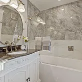 ensuite bathroom with marble like porcelain tiles that accent the soaking tub surround