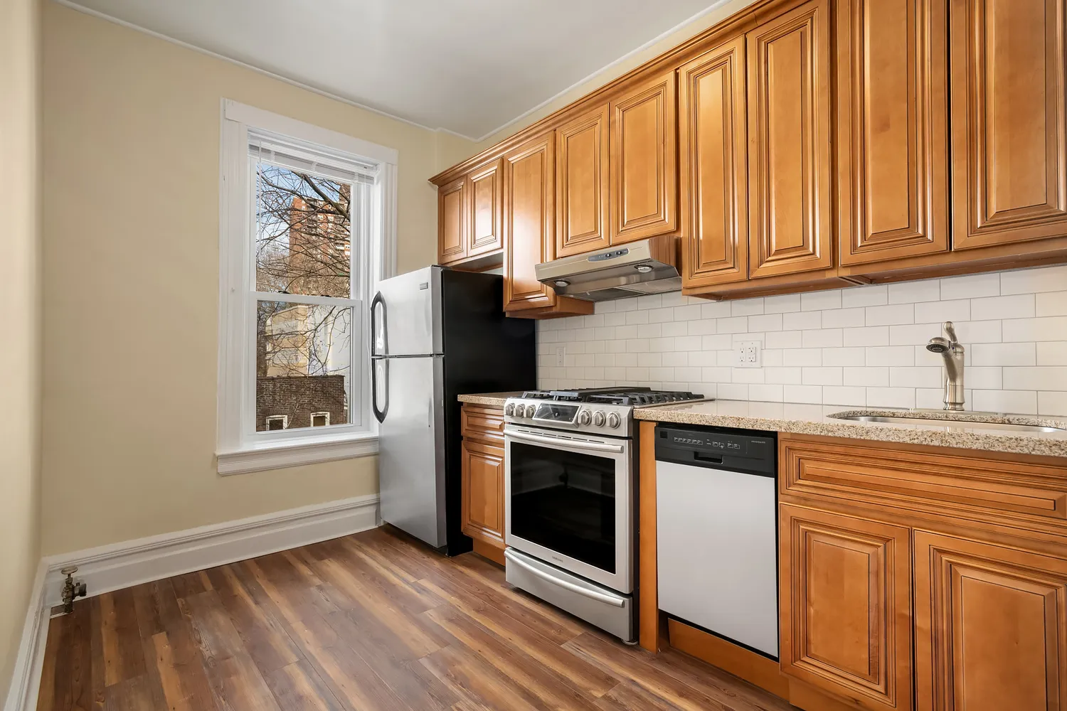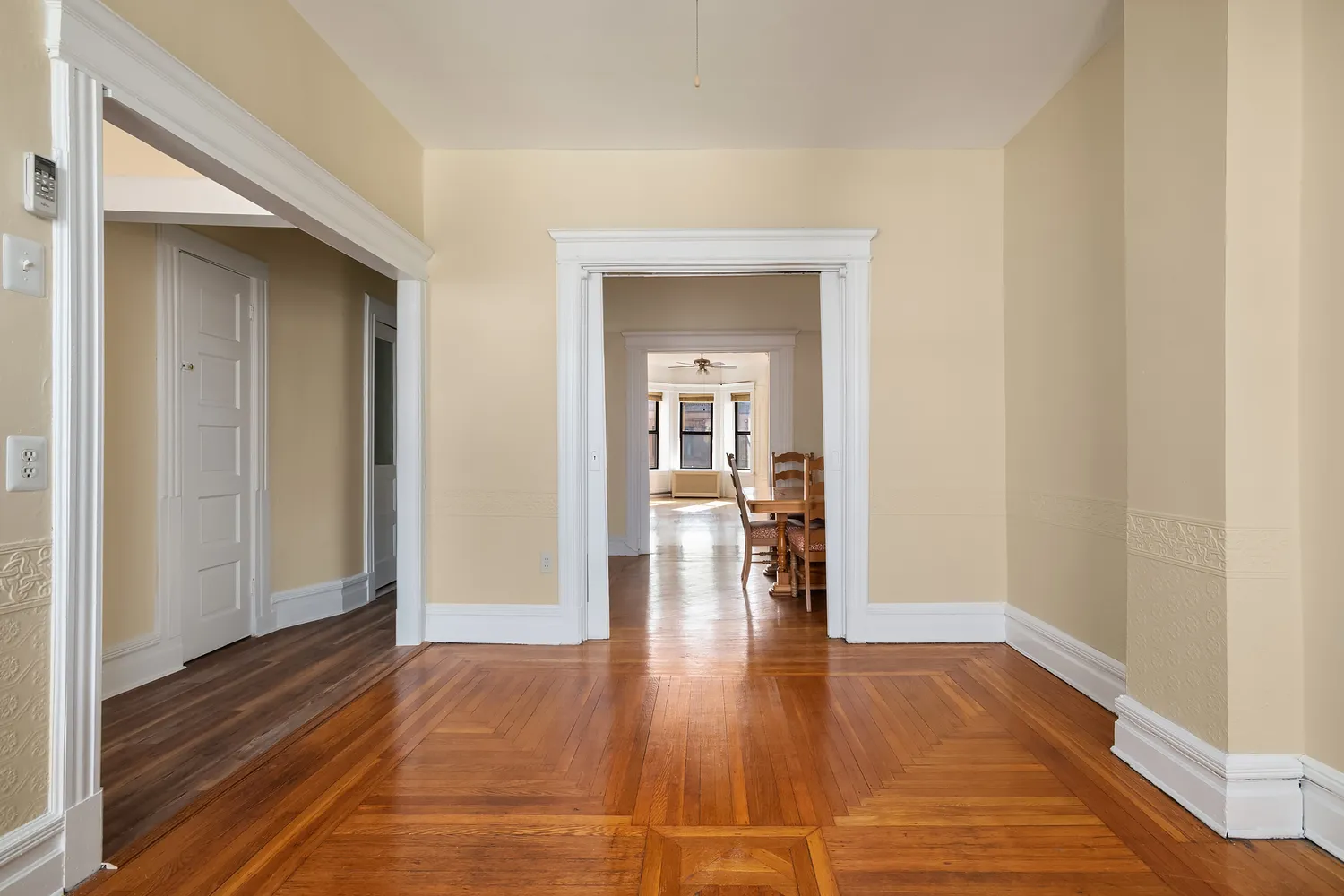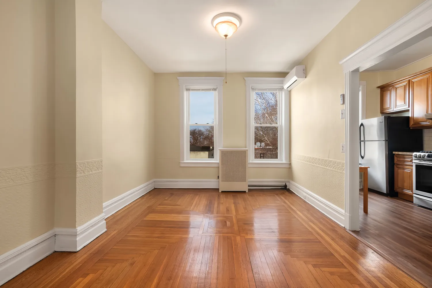 Rarely available, this oversized two bedroom home is located in prime Bay Ridge in a gorgeous brownstone. It features a spacious king-sized master bedroom with lovely bay windows, dressing room, walk-in-closet, second bedroom, an enormous living room, formal dining room which can also be used as a home office and renovated kitchen. Renovated back to its original beauty, the baseboard moldings, thick window and door trims, original and pristine hardwood floors, two sets of pocket doors and architectural pillars are one-of-a-kind and give the home loads of charm. The high ceilings really open up the space and is perched on the top-floor allowing for an abundance of sunlight to flow throughout the day. Enjoy your sun-filled, windowed eat-in-kitchen that has new granite countertops with stainless-steel appliances which include a dishwasher. Another fantastic feature in this home is the newly installed central AC. The renovated bathroom features white subway and mosaic tiles and a unique clawfoot bathtub.