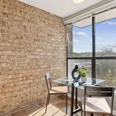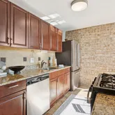 Adjacent to the living area is a dedicated dining space accented with crown moulding and chair rail detailing, which flows seamlessly into an eat-in kitchen overlooking the community. The kitchen features new stainless steel appliances, an under mount sink, updated electrical, and a charming exposed brick accent wall, blending modern function with classic warmth.