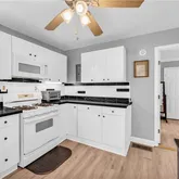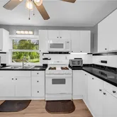 - Kitchen Features: Cabinets White, Tile Counters, View to Family Room