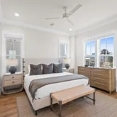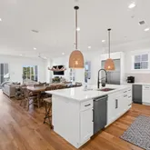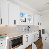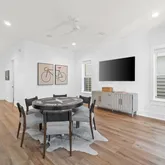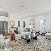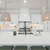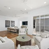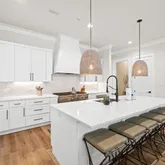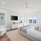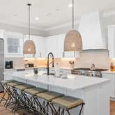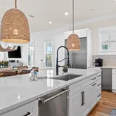 The gourmet kitchen is a chef's dream, featuring a gas range and custom-built vent hood, complete with top-of-the-line appliances, granite countertops, and an oversized island perfect for gathering. Designer details and coastal-inspired finishes flow throughout the home, which features engineered hardwood flooring in the main living spaces and tile in each bathroom, enhancing the light-filled interiors.