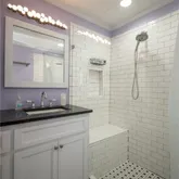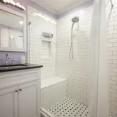 Primary bath fully renovated with custom tiled shower, tiled floors, custom cabinetry, and new fixtures