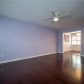 Open living area with cherry-tone floors and plantation shutters